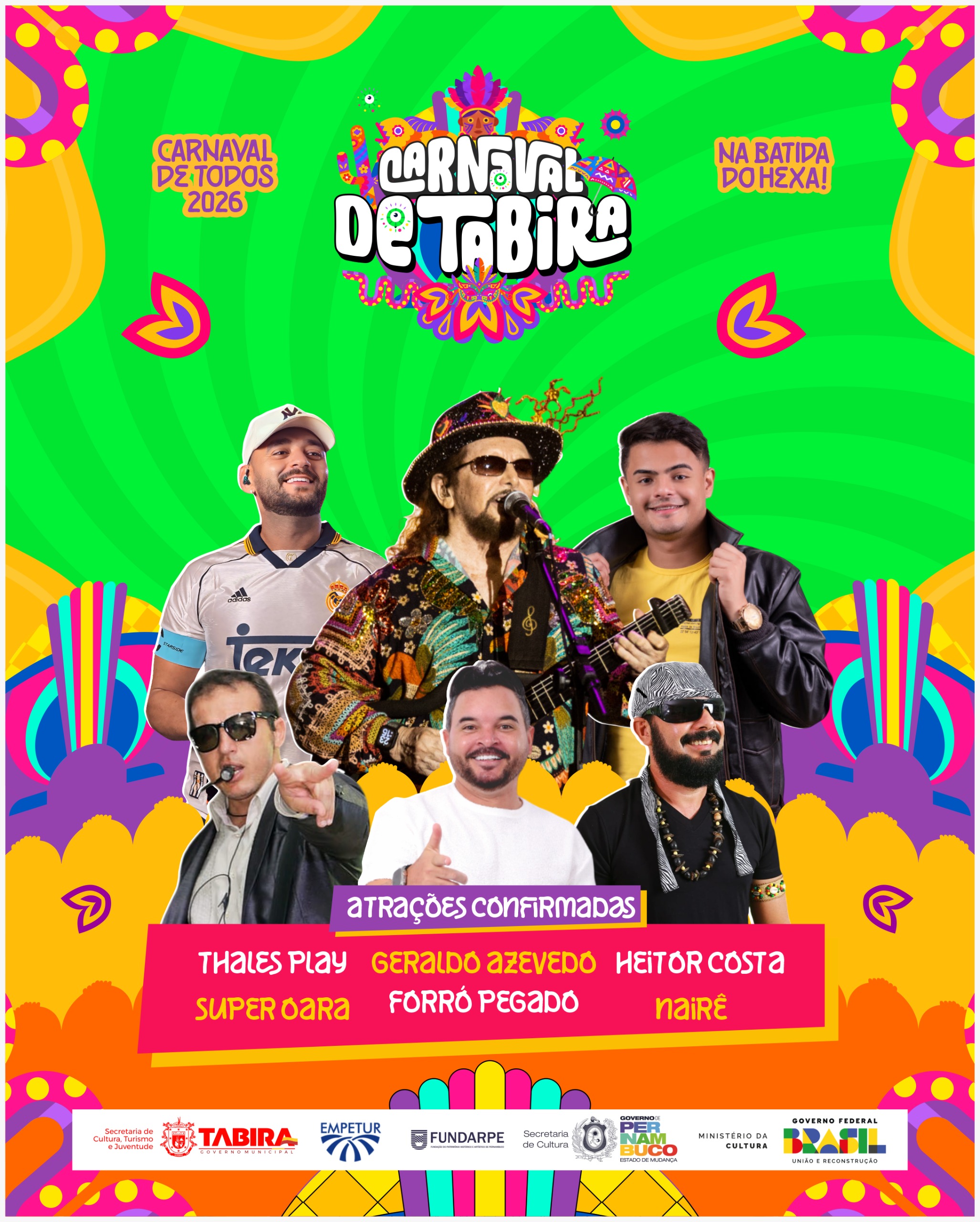 A Prefeitura de Tabira, por meio da Secretaria de Cultura, Turismo e Juventude, iniciou a divulgação das atrações que irão compor a programação do Carnaval 2026, que este ano traz o tema “Carnaval de Todos – Na Batida do Hexa!”. A festa acontecerá entre os dias 13 e 17 de fevereiro, na tradicional Praça Pedro