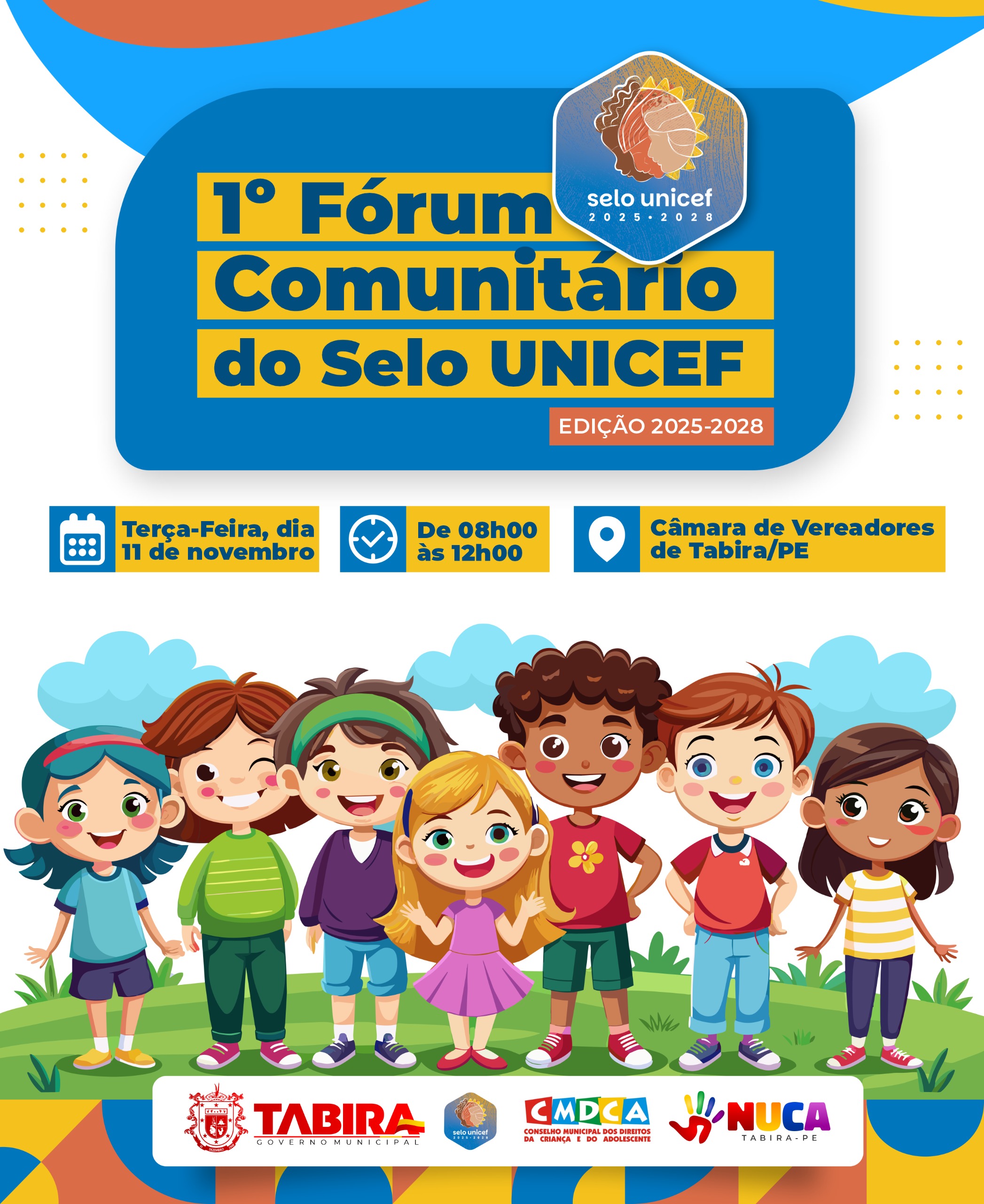 A Prefeitura de Tabira, por meio do Conselho Municipal dos Direitos da Criança e do Adolescente (CMDCA) e do Núcleo de Cidadania dos Adolescentes (NUCA), realiza na próxima terça-feira (11), o 1º Fórum Comunitário do Selo UNICEF – Edição 2025–2028. O encontro acontecerá na Câmara de Vereadores de Tabira, Rua José Justos do Santos, nº 56,