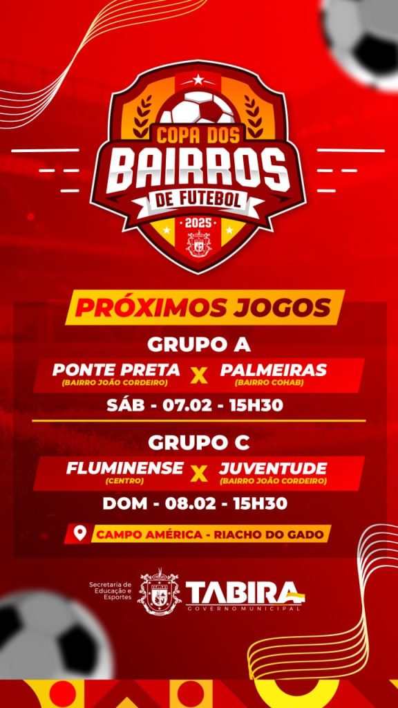 A Copa dos Bairros tem como objetivo incentivar a prática esportiva, promover momentos de lazer e fortalecer os laços entre os bairros de Tabira, reunindo atletas, torcedores e famílias em torno do futebol. A gestão municipal convida a população a comparecer, prestigiar os jogos e apoiar mais essa iniciativa que valoriza o esporte e a cidadania.