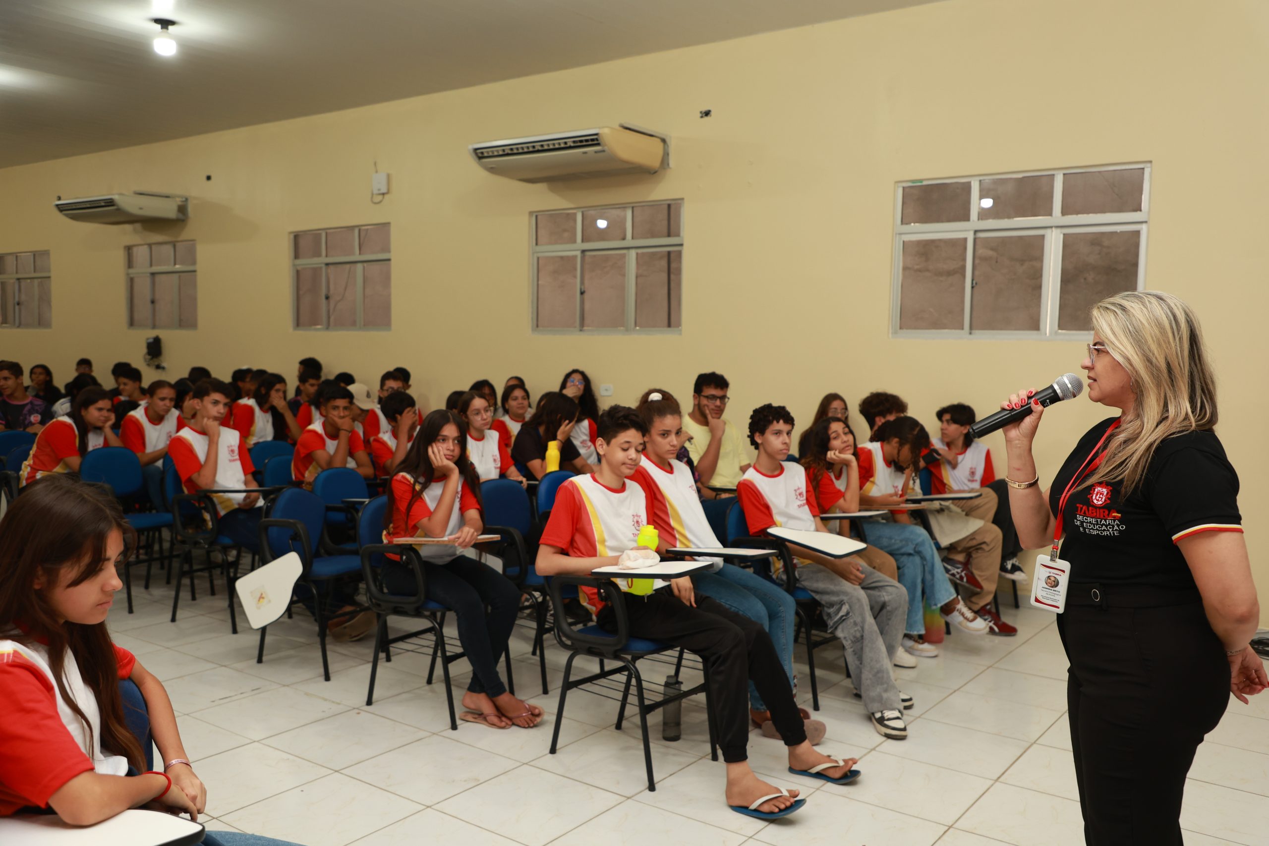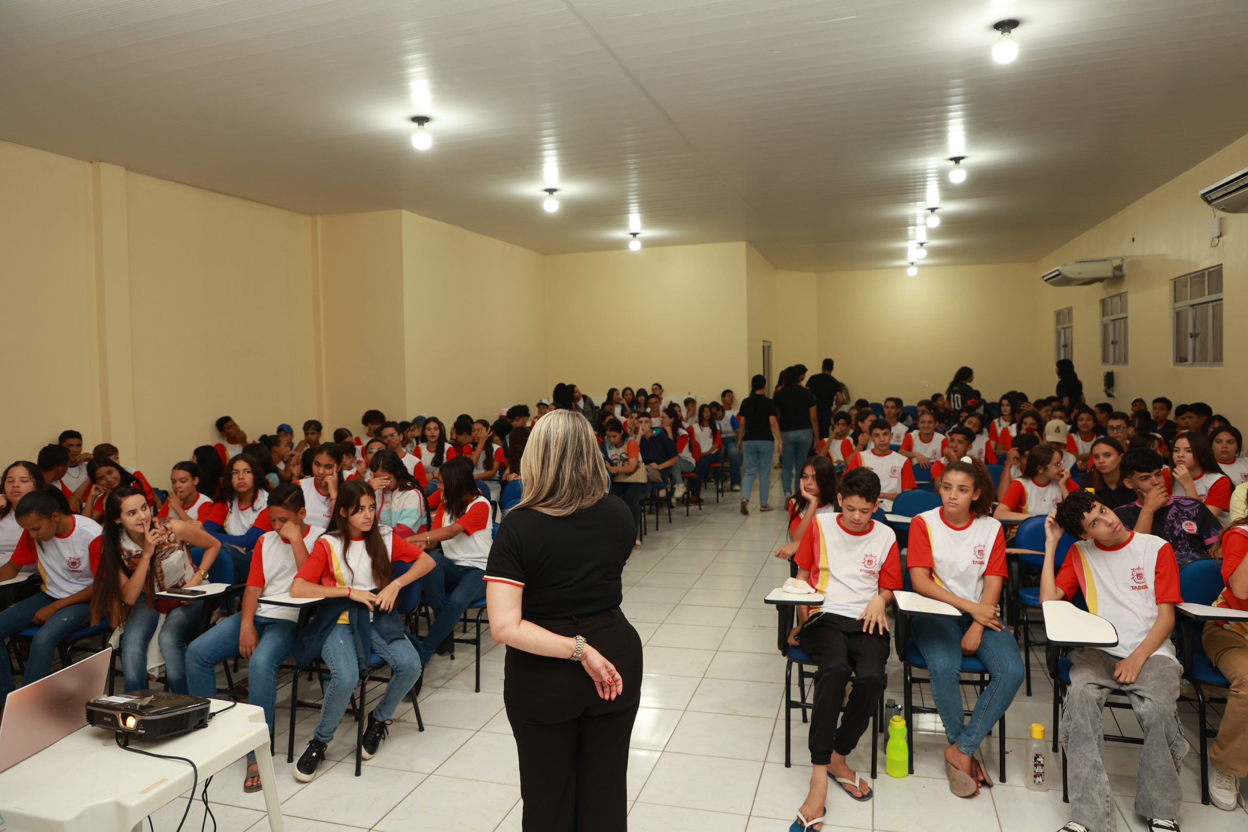 Na sequência, os alunos seguiram para o auditório da Secretaria de Educação, onde participaram de uma roda de conversa conduzida pelos psicólogos André Nogueira e Thaline Siqueira. Em um bate-papo acolhedor e descontraído, os profissionais abordaram temas como foco, autocontrole, ansiedade e estratégias para manter a calma durante a realização das avaliações.