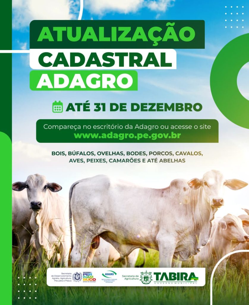 A Prefeitura de Tabira, por meio da Secretaria Municipal de Agricultura, informa aos produtores rurais que o Governo de Pernambuco prorrogou o prazo para a atualização cadastral obrigatória de rebanhos em todo o estado, por meio da Portaria nº 136/2025.