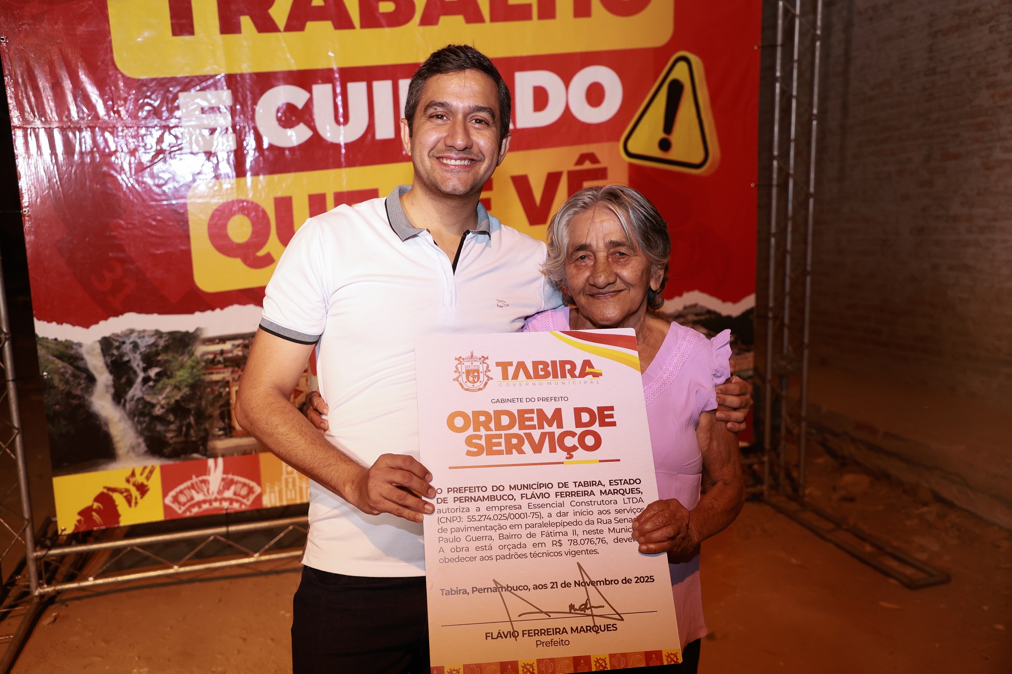 A Prefeitura de Tabira realizou, na noite desta sexta-feira (21), mais uma edição do programa Sextou com Obras, marcada pela assinatura da Ordem de Serviço para a pavimentação da Rua Senador Paulo Guerra, no Bairro de Fátima II. A obra, aguardada há muitos anos pelos moradores, será executada pela empresa Essencial Construtora LTDA, com investimento de R$ 78.076,76, seguindo todos os padrões técnicos vigentes.