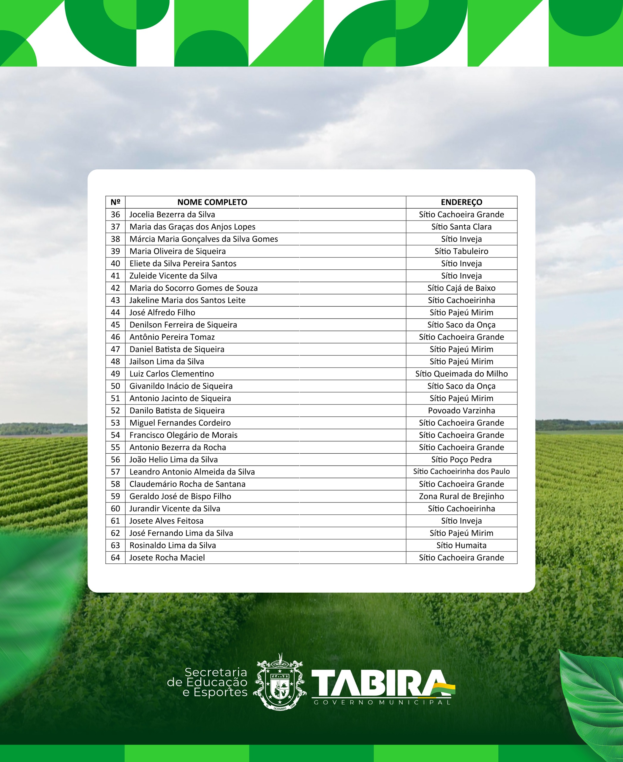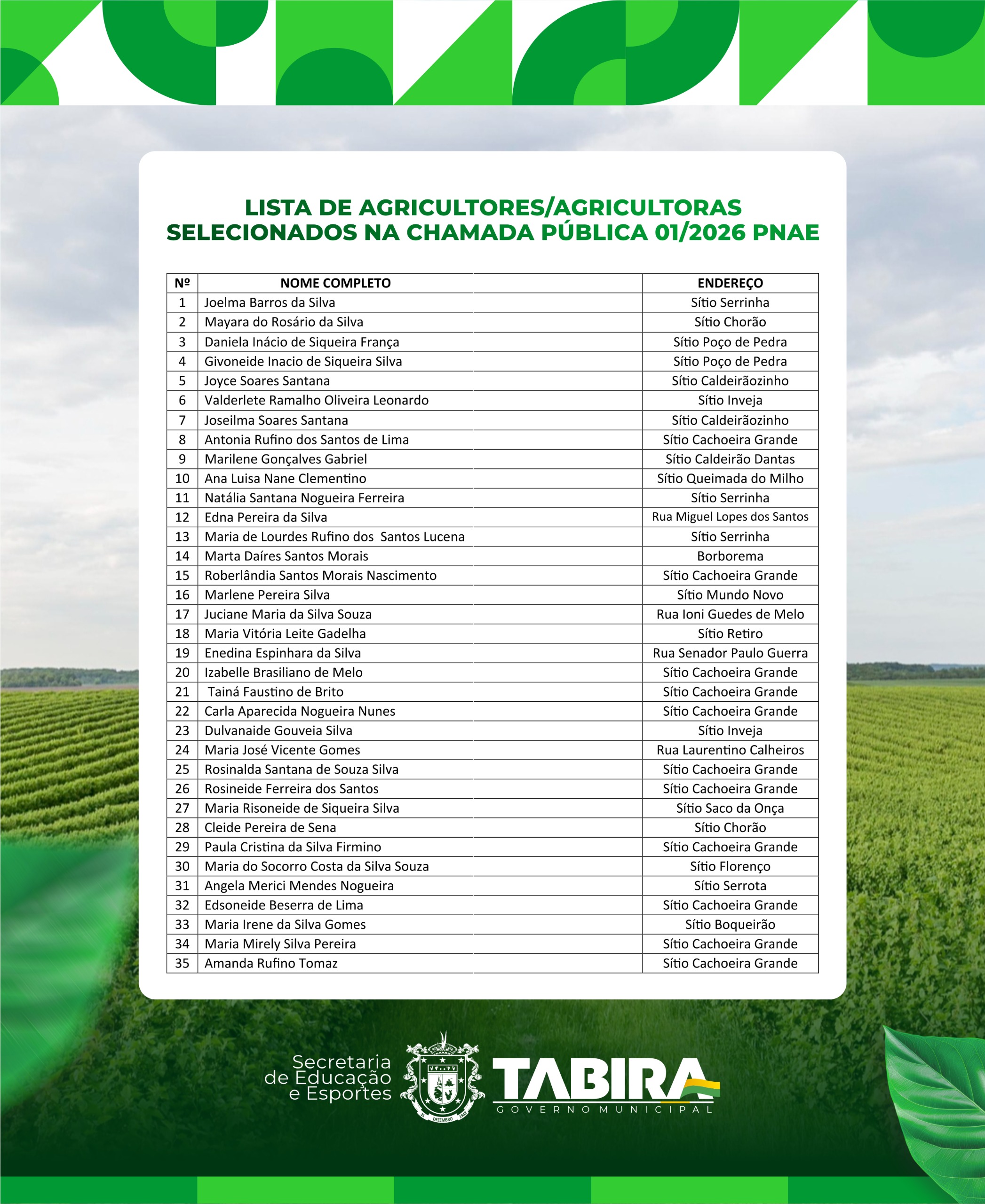 A Prefeitura de Tabira, por meio da Secretaria Municipal de Educação e Esportes, divulga o resultado da Chamada Pública nº 01/2026, que selecionou 64 agricultores e agricultoras familiares para o fornecimento de gêneros alimentícios destinados à merenda escolar da rede pública municipal de ensino.