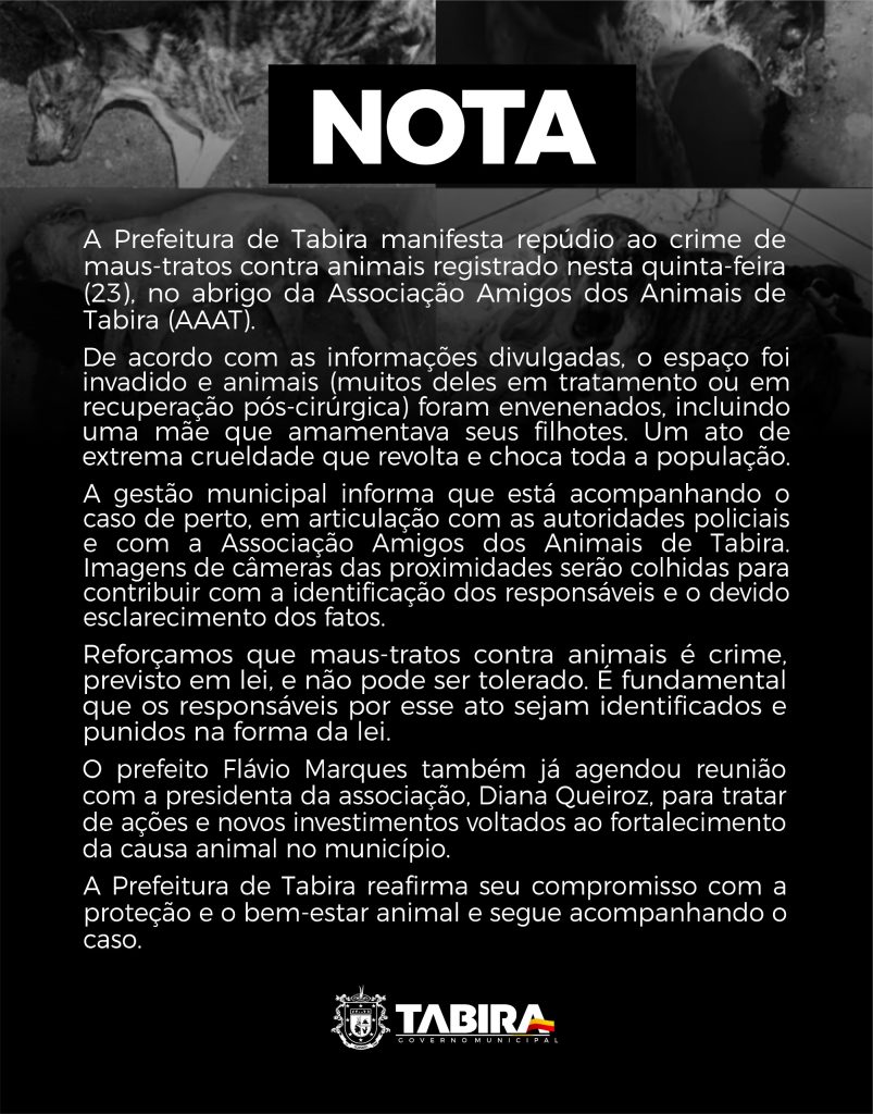 A Prefeitura de Tabira divulgou uma nota oficial manifestando profundo repúdio ao crime de maus-tratos contra animais ocorrido quinta-feira (23), no abrigo da Associação Amigos dos Animais de Tabira (AAAT).