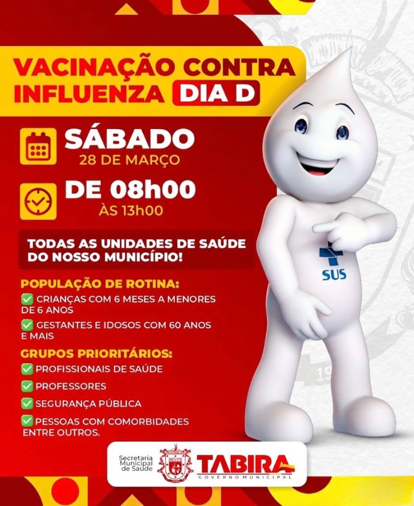 A Prefeitura de Tabira, por meio da Secretaria Municipal de Saúde, realiza neste sábado (28) o Dia D de mobilização da campanha de vacinação contra a Influenza. A ação acontecerá em todas as unidades de saúde do município, das 8h às 13h.